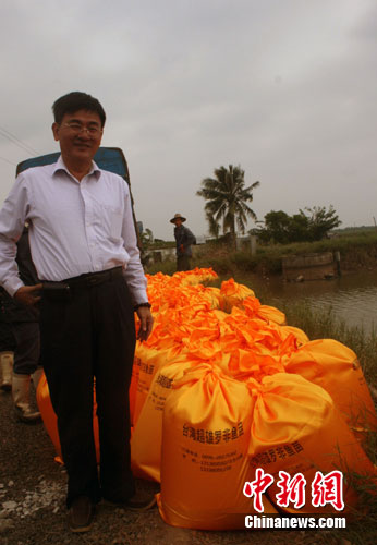 28日,台资海南新海洋水产有限公司总经理刘财添,迎来海南省政府支持灾后恢复生产的第一批鱼苗。 作 者:关向东