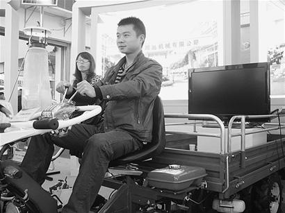在台湾特色馆,一架特色机器吸引了许多人参观。这款在台湾称为“爬山虎”的田园搬运管理机,特色在于能够像老虎一样,自由地穿行在山路间,据介绍,它的秘诀就是“人字形齿轮状”的轮胎,可以防止打滑、陷入泥泞中。它载重500公斤,只要是25度到45度之间的坡度,都可以成功地翻越。