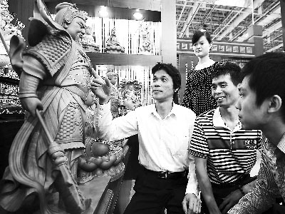 刚刚闭幕的厦门国际佛事用品展吸引了600多家参展商,其中台资企业占了四成,台湾参展商的展品以种类繁多、做工精细而大受追捧,认识阿贵师便是在频频响起的照相机快门声中。其时,他正专注地修饰着一尊滴水观音的面部,这尊观音线条细腻流畅,神情慈蔼素静,让人观之顿生敬重亲近之意。围绕着观音像的还有释迦牟尼、妈祖、关公、济公、保生大帝等佛道神祇和民间信仰的神灵,他们均以台湾桧木、梢楠、牛樟、黑檀、绿檀等优质木料手工雕刻而成,无不形神兼备工艺精湛。