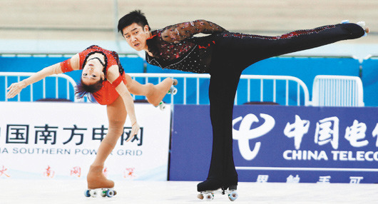 陈立昕(右)及翁慈霞昨天在亚运滑轮溜冰花式双人组短曲预赛暂居第一,今天拼金牌,也是抗癌大作战。