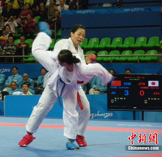 26日,亚运史上首次空手道“海峡德比”在广东体育馆上演,最终在女子68公斤级半决赛中,中国选手冯兰兰通过延长赛以3比0完胜中华台北选手刘亚力,并在决赛中力克日本选手本间绘美子夺冠。