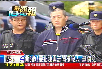 1998年,陈勇志在台南路易十三酒店开枪射击,造成2人死亡,同一年,陈勇志又在台中普罗酒店持冲锋枪疯狂扫射上百发,流弹波及一名妇女致死。1999年台中广三SOGO枪击案,陈勇志开枪波及一名正在逛街的孕妇庄嘉慧,造成胎儿夭折,庄嘉慧成了植物人。(中国台湾网 吴斌)