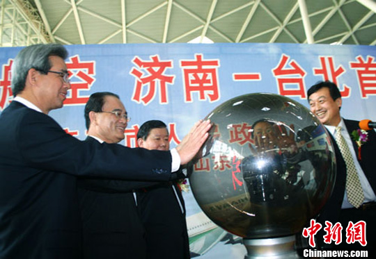 “首航成功!”迎接的人们向来自台湾的客人送上了鲜花。从今天开始,台湾长荣航空正式开通了台北至济南的直航航线,济南机场保障200座以上大型客机的升落也由此启动。