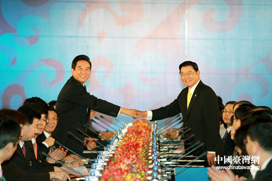 12月21日上午9时,两岸两会领导人第六次会谈在台北圆山饭店举行,海协会会长陈云林与海基会董事长江丙坤在台北再度握手。(中国台湾网 钟宝华 摄)
