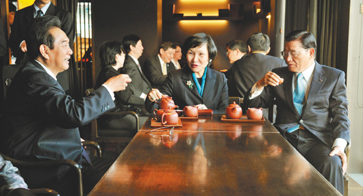 海协会会长陈云林(左)20日下午在台湾海基会董事长江丙坤(右)陪同下参观台北故宫,两人参观后一起喝茶并闲话家常。台北故宫院长周功鑫(中)陪同。 来源:台湾《联合报》