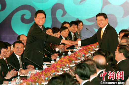 12月21日上午,海协会会长陈云林与海基会董事长江丙坤的两会领导人第六次会谈在台北圆山饭店举行。图为陈江二人在会谈开始时相互握手致意。 中新社记者 黄少华 摄