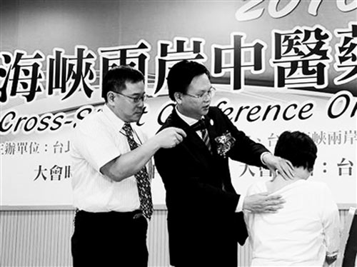 近日,由广西医师协会、广西中医药学会、台北中医师公会、台湾海峡两岸医药合作协会共同举办的2010年海峡两岸中医药学术大会在台大医院举行。这是与会专家现场演示按摩医治手法。 刘 岩摄