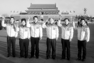 乔继锋(左四)等6位农民兄弟在北京天安门前合影。吴明 摄