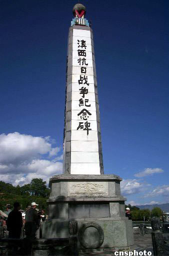 资料图:2002年,云南隆重纪念滇西抗战暨赴缅对日作战60周年,与会者在瞻仰滇西抗战纪念碑。 中新社发 纳家骅