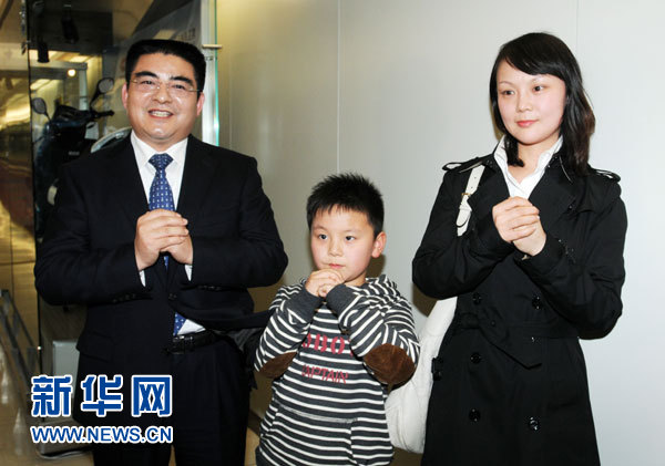 1月26日,陈光标(左)携妻儿抵达台湾桃园机场。当日,大陆著名慈善家陈光标抵达台湾,与他同行的还有50多名大陆企业家。按计划,他们于27日开始在台湾9个县市发放“感恩红包”,每个红包从1万新台币到5万新台币不等,价值总计约1.1亿元人民币。 新华社发