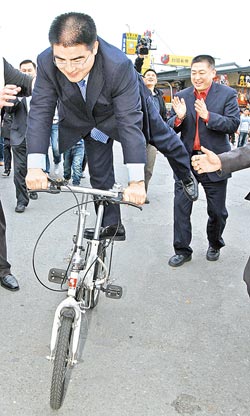 大陆首善陈光标29日到南投紫南宫参拜时看到路旁有脚踏车,一时兴起,表演单脚骑车特技。