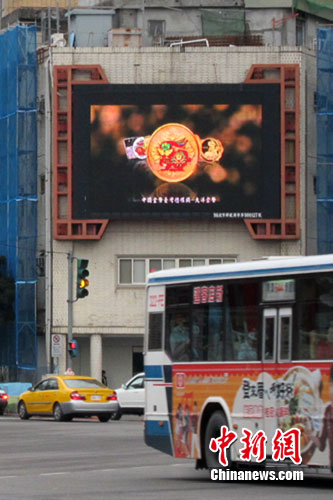 2011年辛卯兔年春节将至,图为中国金币总公司在台湾的总经销台湾大洋金币公司在台北市闹市区“台北博爱特区”大型电视屏幕上播放的中国人民银行发行的2011辛卯兔年金银纪念币广告。