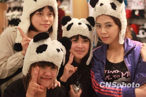 来到台北木栅动物园熊猫馆参观的4位年轻台湾女孩在熊猫纪念品店选购纪念品,并一起戴上熊猫帽子合影留念。随着“团团”“圆圆”成为木栅动物园里的动物明星,大熊猫在台受热捧,引来参观客络绎不绝。(图为资料图) 中新社发 罗钦文 摄