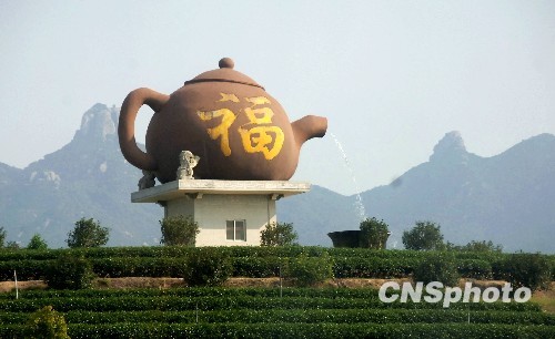 6月13日,一巨型茶壶树立在位于福建漳州的“世界茶王”台商李瑞河茶园内。有“世界茶王”之称的台商李瑞河是台湾南投人,20世纪90年代初来到漳浦创办天福茶庄,经营两岸茶业,目前在世界各地开有1008家直营店。 中新社发 王东明 摄