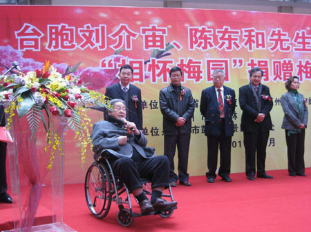 台胞刘介宙、陈东和先生赠送给鼓山的两千多株梅花树,在暖暖的春意中已绽放出红粉的小花,昨天捐赠仪式和“福州鼓山相怀梅园”的揭牌仪式在鼓山新梅园举行。年过八旬的刘介宙先生特地从台湾赶来出席了捐赠仪式,以“相怀”之名传达“两岸相怀”的美好愿望。