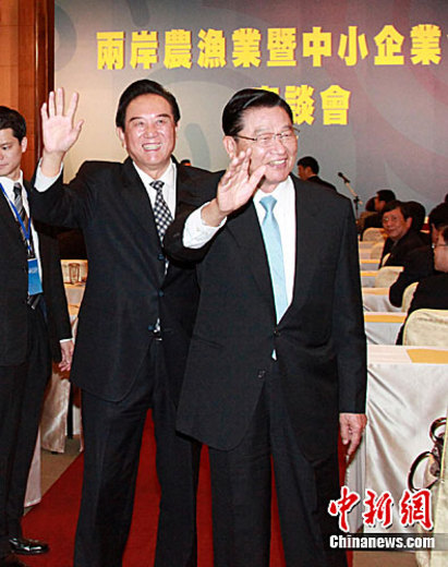 2月25日下午,正在台湾参访的海协会会长陈云林一行来到嘉义市,与台湾海基会董事长江丙坤及企业界人士共同出席两岸农渔业暨中小企业合作座谈会。图为陈云林(左)与江丙坤在会场向媒体记者打招呼。中新社记者 符永康 摄