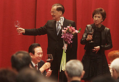 报道说,26日晚国民党荣誉主席连战设立晚宴,宴请海协会经贸代表团。连战特地赠送一幅自己写的“报德存忠厚、怀仁豫太和”给陈云林,连战笑称“字写不好,但独树一格”;陈云林也回赠一幅熊猫国画。