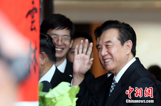 2月26日,海协会会长陈云林率经贸考察团来到台湾农业大县云林县参访,当地农会巧妙打出“云林欢迎陈云林”等条幅。图为陈云林在云林科技大学听取农产品登陆等相关介绍前,向记者挥手致意。中新社记者 董会峰 摄