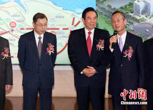 2月27日上午,正在台湾参访的大陆海协会会长陈云林一行分别到台北港、远雄自由贸易港区参观考察。图为陈云林(中)在台湾海基会副董事长高孔廉(左一)陪同下参观位于桃园县大园乡的远雄自由贸易港区,远雄企业团董事长赵藤雄(右一)作现场介绍。中新社记者 符永康 摄