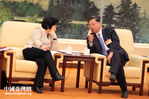 全国人大代表、福建省省长黄小晶(右一)与孙春兰交谈。 (中国台湾网 王伟 摄)