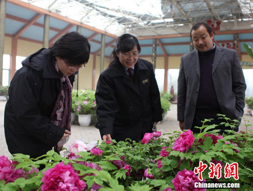洛阳出入境检验检疫局工作人员正在对参展牡丹生长情况进行观察。