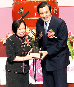马英九颁发“两岸和平特殊贡献奖”给前海基会董事长辜振甫夫人辜严倬云女士。图片来源:台湾《经济日报》