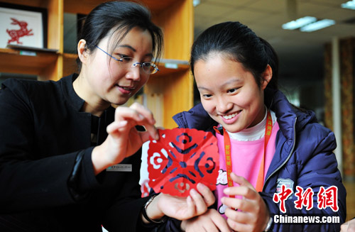3月18日,“2011海峡两岸少年儿童科技嘉年华”在四川成都启动。图为成都老师正在教台湾孩子学习民俗剪纸。中新社发 刘忠俊 摄