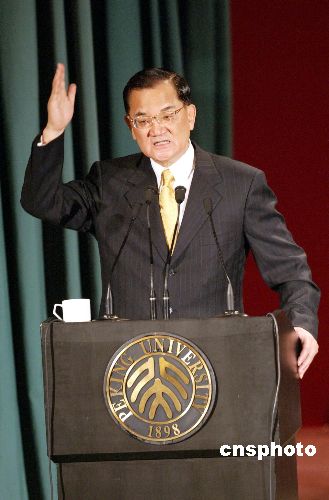 资料图:二零零五年四月二十九日,中国国民党主席连战在北京大学发表演讲,受到北大师生的热烈欢迎。 中新社发 廖文静 摄