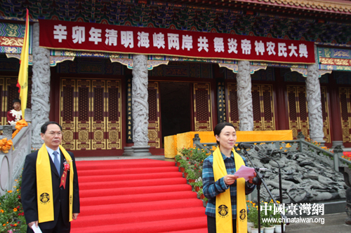 辛卯年清明海峡两岸共祭炎帝神农氏大典今日在湖南炎陵举行。图为祭祀仪式前,中共湖南省委常委李微微在致辞。(中国台湾网 杨丽 摄)