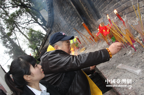 在工作人员的协助下,81岁的鲁灿云老先生从陵园入口一路跋涉至炎帝陵前,虔诚为始祖敬香。(中国台湾网 杨丽 摄)