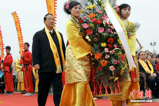 4月5日上午,中国·洪洞二十一届大槐树寻根祭祖大典在山西洪洞大槐树寻根祭祖园举行,中国台湾亲民党主席宋楚瑜参加大典。图为亲民党主席宋楚瑜祭祖敬献花蓝。中新社发 张云 摄