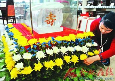 工作人员正在为安放刘铭传遗骨的水晶棺布置鲜花