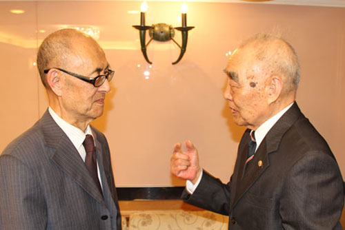 史式教授(左)在台湾和著名爱国人士岳天将军见面,两位过90岁高龄的历史老人阔别半个世纪后握手交谈。(摄影:岳湛)