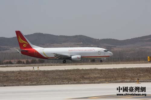 “繁星”、“点点”、“喜羊羊”、“乐羊羊”顺利抵达威海机场。图为飞机着陆后滑行。(中国台湾网 刘海伟 摄)