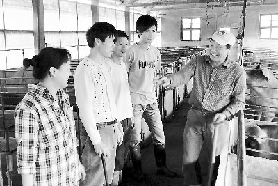 曾金雨(右)在猪场与员工讨论种猪养殖方法。