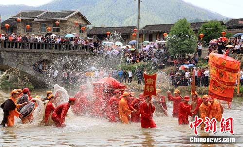 在小溪中,十多位村民装扮成虾兵蟹将、水怪的模样在前头拦路,并且不断地用水泼轿子。抬轿的青壮年则左冲右突,冲破重重障碍,直奔天 后宫,演绎着妈祖不畏风大浪高救难救世的功绩。整个过海仪式三进三出,古朴、热闹。作 者:刘文福