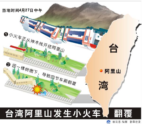 图表:台湾阿里山发生小火车翻覆截至4月27日15时30分,在阿里山小火车翻车事故中,共有5个大陆旅行团涉及,已确认23人受伤、5人死亡、1人失踪,确认死亡的5人均为大陆游客。新华社发