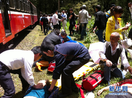 4月27日,救援人员在台湾阿里山小火车翻车事故现场实施救援。新华社发