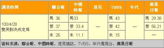 2012年台湾大选“双英”对决成局后,台湾各家媒体都做了最新选情民调,《联合报》调查结果,双英呈现五五波局面,但是台湾《苹果日报》调查结果,蔡英文支持度大幅领先马英九。图片来源:台湾《联合报》