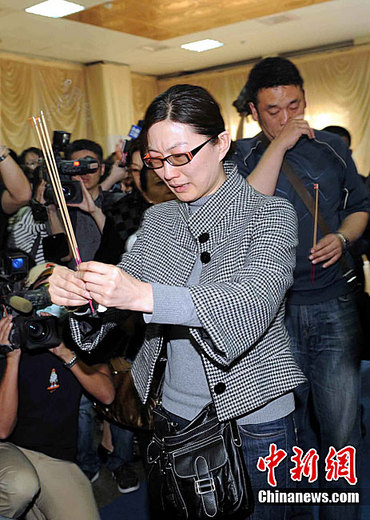 首批阿里山小火车意外事件死者家属,29日早上到殡仪馆认尸。徐熙芬家属难掩内心哀伤激动痛哭,在灵堂上香。中新社发 谭达明 摄