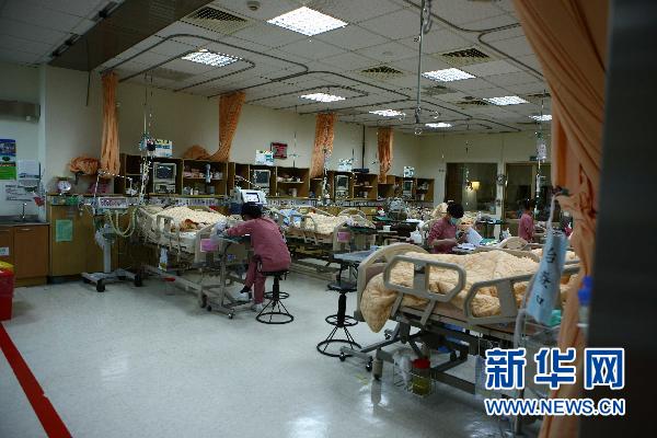 新华社照片,嘉义(台湾),2011年4月28日 阿里山火车事故伤者继续接受治疗 4月28日,工作人员在台湾嘉义市圣马尔定医院的加护病房内忙碌。当日,在阿里山火车事故中受伤的大多数乘客已出院,目前留在圣马尔定医院接受治疗的还有16人,其中两名重伤员仍在加护病房中接受治疗。台湾阿里山27日中午发生小火车翻车事故,截至当天晚间11时,事故已造成5名大陆游客罹难,百余名大陆游客不同程度受伤。 新华社记者龚兵摄