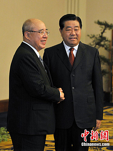 2011年5月6日下午,中共中央政治局常委、全国政协主席贾庆林在成都会见了出席第七届两岸经贸文化论坛的中国国民党荣誉主席吴伯雄及应邀参加第七届两岸经贸文化论坛的两岸部分嘉宾。图为贾庆林(右)在成都会见吴伯雄(左)。中新社发 刘忠俊 摄