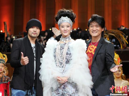 宋祖英2011台北小巨蛋演唱会将于8日母亲节晚间正式登场。图为主办方7日举行彩排记者会,宋祖英(左2)与周华健(右2)周杰伦(左1),以及演唱会主持人徐乃麟(右1)齐亮相。路梅 摄