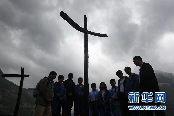 资料图片:5月9日,在“5.12”汶川地震重灾区四川省青川县东河口地震遗址公园,在青川参加灾民安置房援建工作的香港迪士尼乐园的志愿者在雨中默哀。 新华社记者 任正来 摄