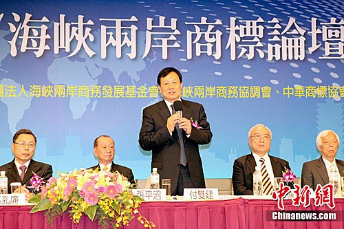 5月10日,国家工商行政管理总局副局长付双建(中)率中华商标协会代表团,参加在台北举行的2011海峡两岸商标论坛。付双建表示,两岸商标保护与发展形势渐入佳境。中新社发 路梅 摄