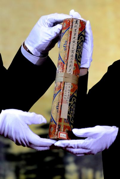 5月11日,工作人员在启运仪式上展示《富春山居图》(剩山图)。 当日,浙江省博物馆的“镇馆之宝”《富春山居图》前半段(剩山图)赴台启运仪式隆重举行。《富春山居图》(剩山图)在浙江省博物馆点交启运,将经由北京后赴台,于6月1日在“山水合壁——黄公望与《富春山居图》特展”上,与台北故宫博物院所藏《富春山居图》(无用师卷)联合展出。这将是该画作两部分在分别360年后首次实现合璧。新华社发(梁臻 摄)