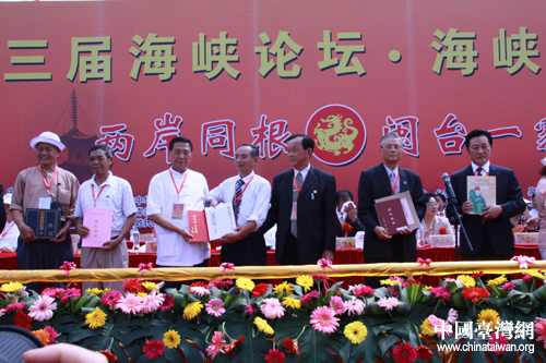海峡百姓论坛开幕,两岸宗亲代表交换族谱。(中国台湾网 于斯文 摄)