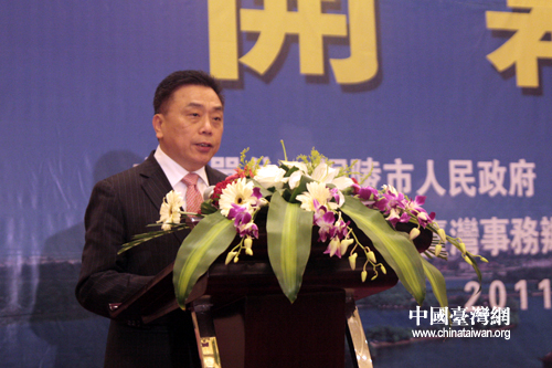台企联会长郭山辉在台企联台资企业产业转移示范区对接交流会上发言。(中国台湾网 马迪 摄)