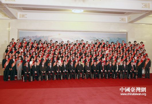6月27日上午,对台工作先进集体、先进个人表彰大会在北京人民大会堂举行。图为中共中央政治局常委、全国政协主席贾庆林见对台工作先进集体和先进个人代表并合影留念。 (中国台湾网 田云鹏 摄)
