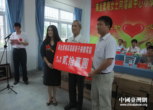 中国台湾网6月28日巢湖消息 日前,台湾知名人士高金素梅女士一行回到家乡安徽省巢湖市居巢区省亲,并向居巢区坝镇镇中心小学捐赠一批价值人民币20万元的电脑设备。坝镇中心小学师生200多人参加了爱心捐赠仪式。